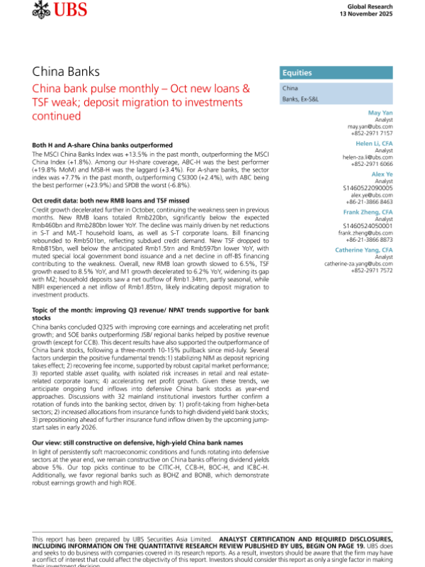 【UBS】【202511】China bank pulse monthly- Oct new loans &TSF weak; deposit migration to investments continued-27页 证券期货研究报告