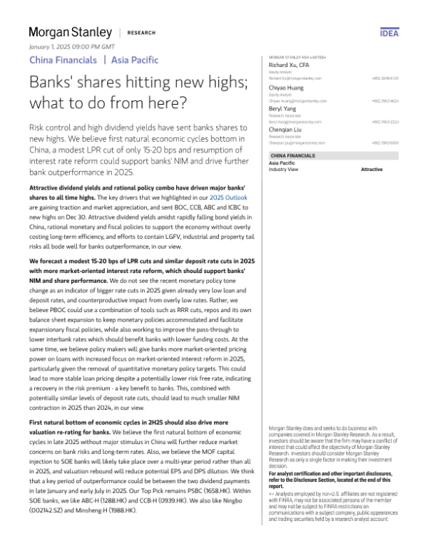 【Morgan Stanley】【2024】中国金融银行业股票创新高;接下来该怎么做?-22页 行业研究