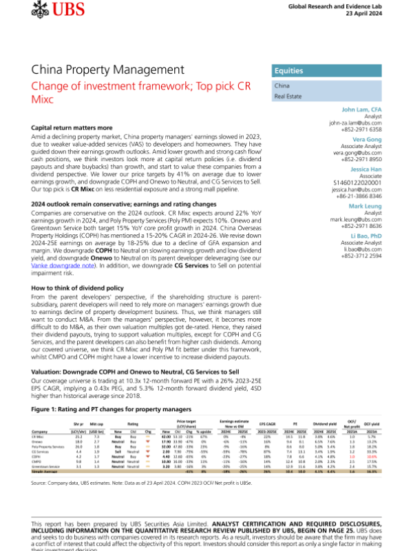 【UBS Securities Asia Limited】【20240423】UBS Equities-China Property Management _Change of investment framework; Top pick CR Mixc-33页 行业研究