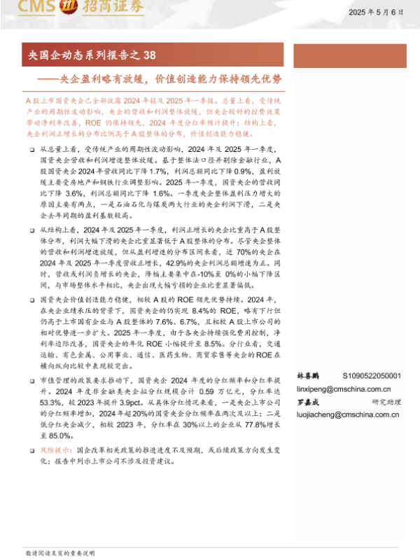 【海通证券】【20250506】央国企动态系列报告之38:央企盈利略有放缓,价值创造能力保持领先优势-38页 证券期货研究报告