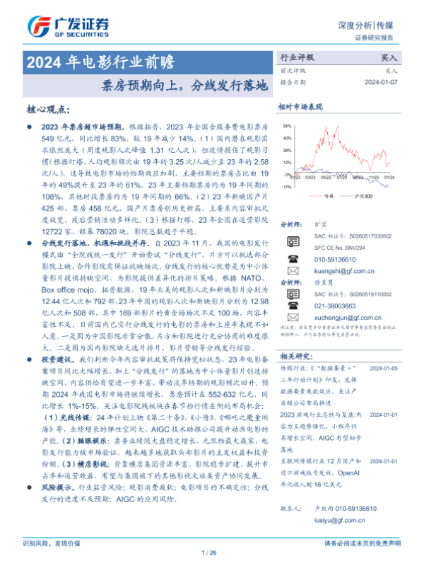 【广发证券】【20240107】2024年电影行业前瞻:票房预期向上,分线发行落地-26页 行业研究