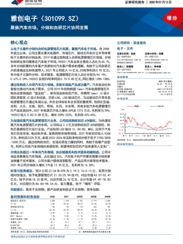 【东方财富证券】【20220714】雅创电子(301099)深度研究:乘汽车电子之风,分销、自研IC齐并进-26页 行业研究
