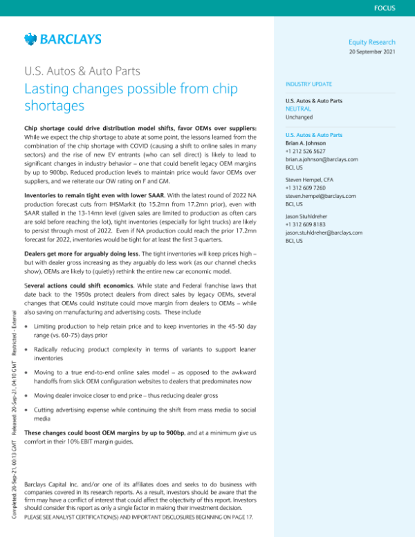 【Barclays Capital Inc.】【20210920】巴克莱-美股汽车及汽车配件行业-芯片短缺可能带来持久的变化-27页 行业研究