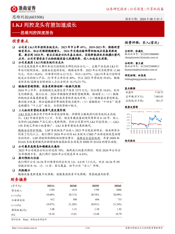 【浙商证券】【20240801】思维列控(603508)深度报告:LKJ列控龙头有望加速成长-24页 行业研究
