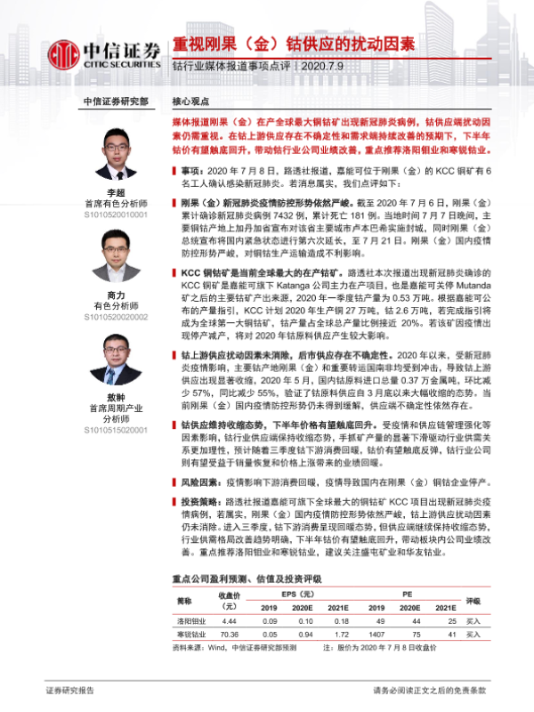 【中信证券】【20200709】钴行业媒体报道事项点评:重视刚果(金)钴供应的扰动因素-3页 行业研究
