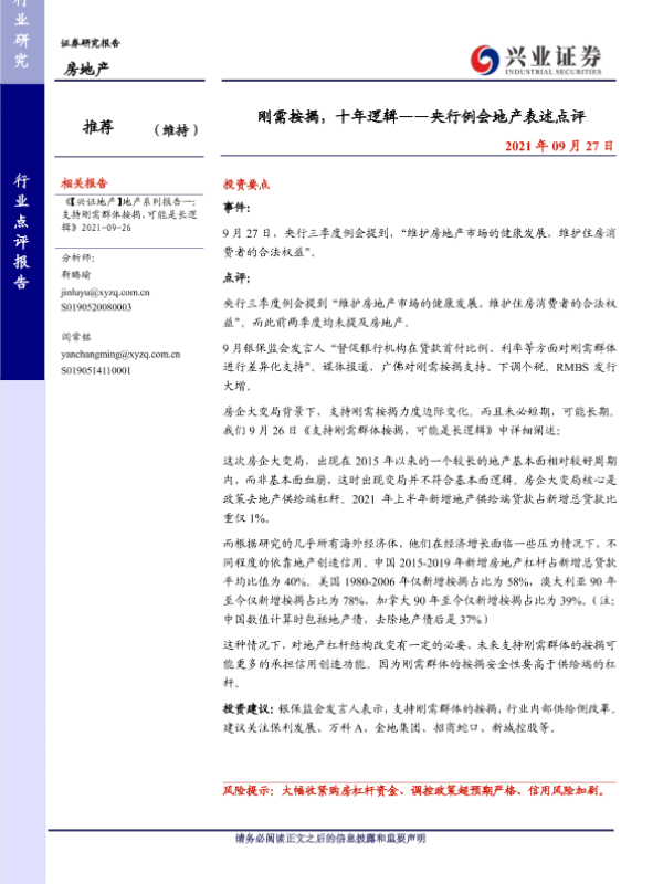 【兴业证券】【20210927】刚需按揭,十年逻辑——央行例会地产表述点评-2页 行业研究