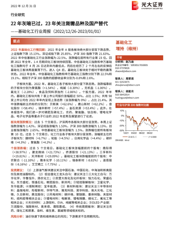 【光大证券】【20221231】20221231-光大证券-基础化工行业周报:22年灰暗已过,23年关注刚需品种及国产替代-30页 行业研究