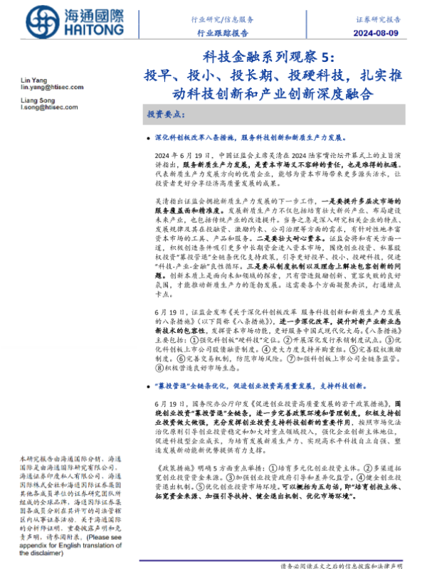 【海通国际】【20240809】信息服务行业跟踪报告:科技金融系列观察5:投早、投小、投长期、投硬科技,扎实推动科技创新和产业创新深度融合-10页 行业研究