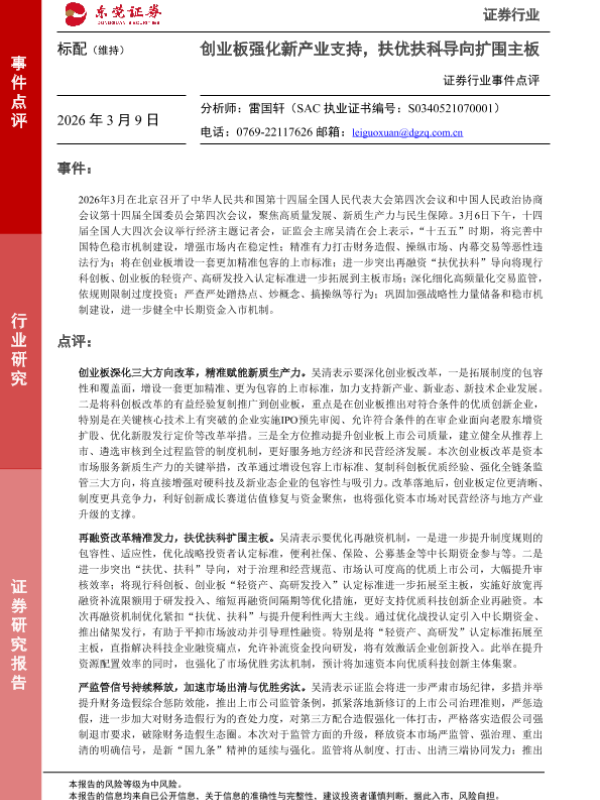 【东莞证券】【202603】创业板强化新产业支持,扶优扶科导向扩围主板-3页 证券期货研究报告