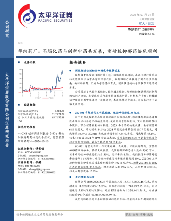 【太平洋证券】【20250724】华纳药厂:高端化药与创新中药共发展,重磅抗抑郁药临床顺利-31页 公司研究