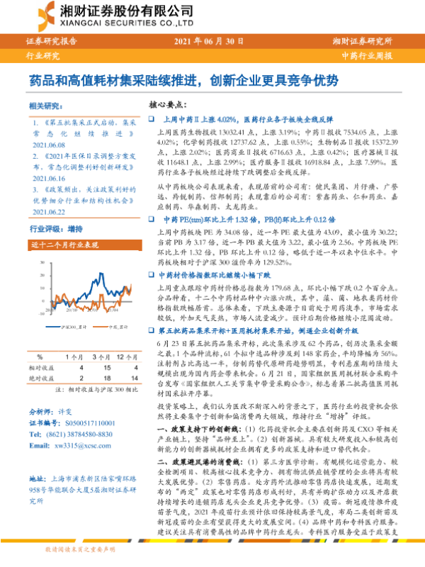 【湘财证券】【20210630】中药行业周报:药品和高值耗材集采陆续推进,创新企业更具竞争优势-12页 行业研究