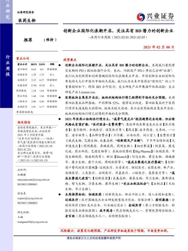【兴业证券】【20210208】创新企业国际化浪潮开启,关注具有BD潜力的创新企业-14页 行业研究