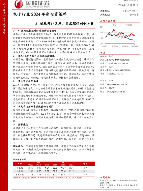 【国联证券】【20231222】电子行业2024年度投资策略:AI赋能硬件复苏,需求驱动创新加速-51页 行业研究