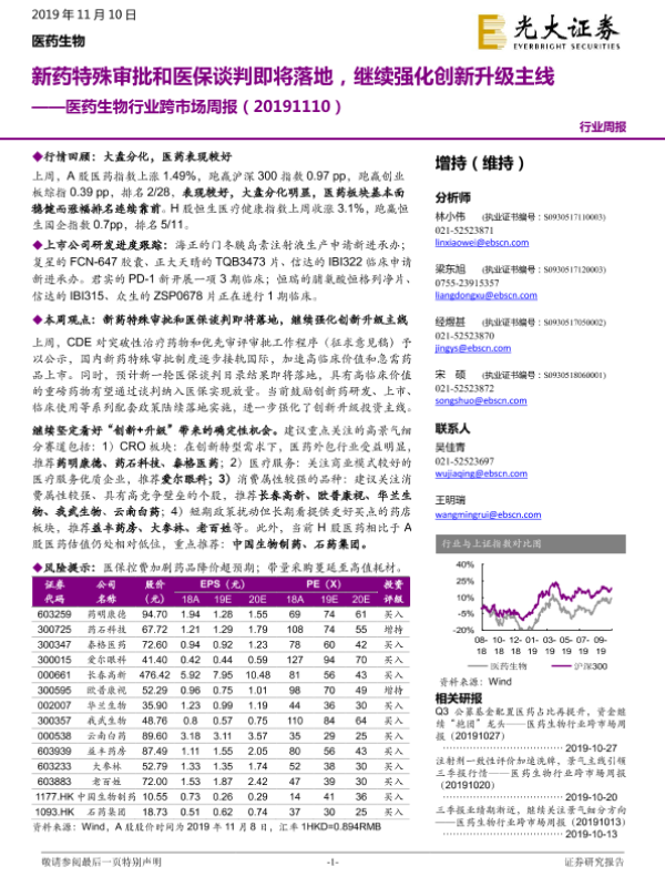 【光大证券】【20191110】医药生物行业跨市场周报:新药特殊审批和医保谈判即将落地,继续强化创新升级主线-33页 行业研究