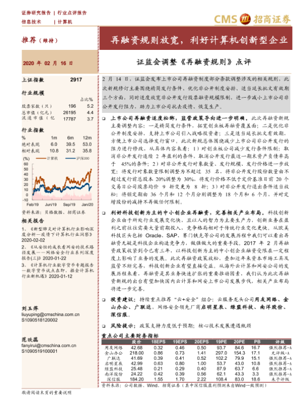 【海通证券】【20200216】计算机:证监会调整《再融资规则》点评:再融资规则放宽,利好计算机创新型企业-4页 行业研究