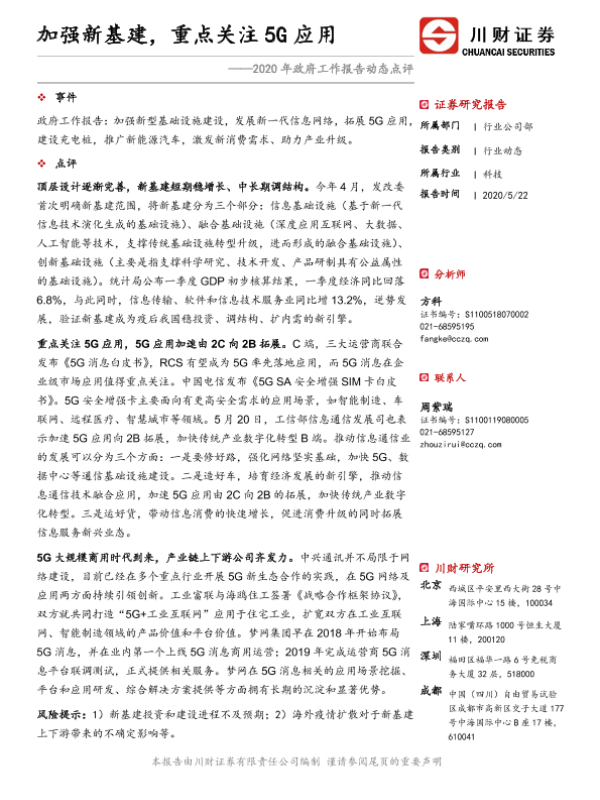 【川财证券】【20200522】2020年政府工作报告动态点评:加强新基建,重点关注5G应用-2页 证券期货研究报告