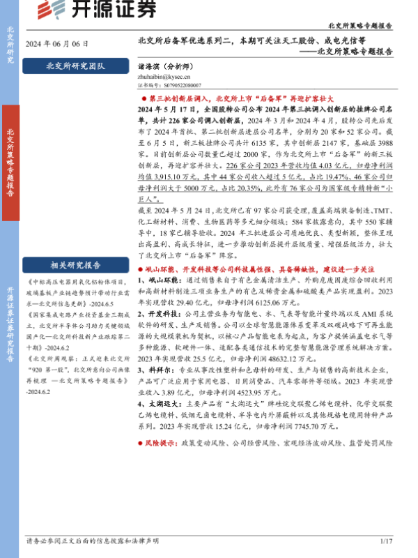 【开源证券】【20240606】北交所策略专题报告:北交所后备军优选系列二,本期可关注天工股份、成电光信等-17页 行业研究