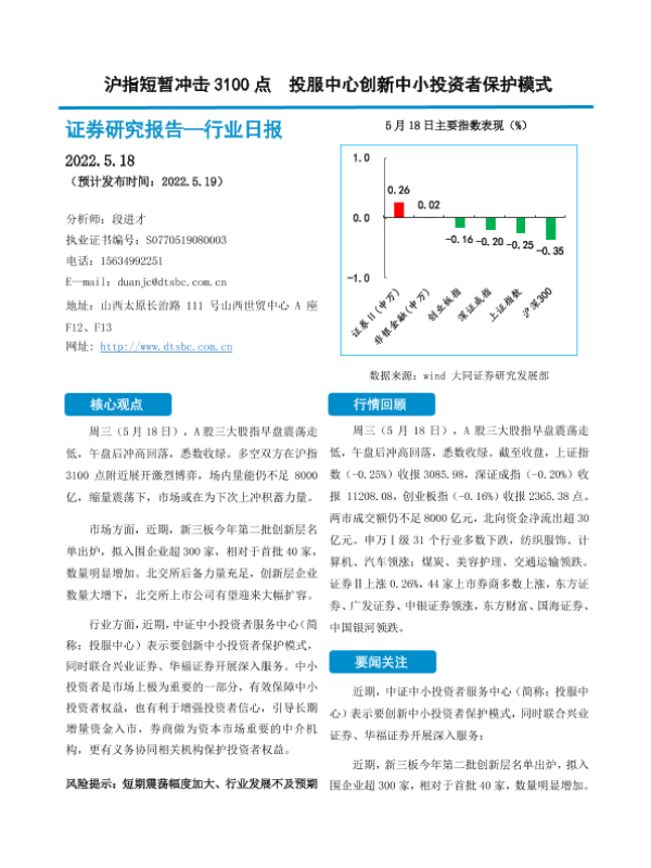 【大同证券】【20220518】沪指短暂冲击3100点投服中心创新中小投资者保护模式-10页 行业研究