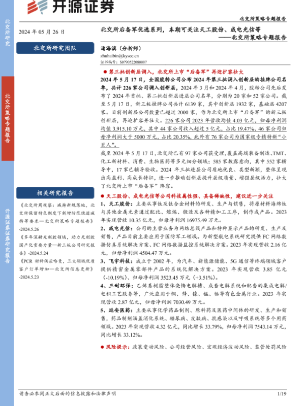 【开源证券】【20240526】北交所策略专题报告:北交所后备军优选系列,本期可关注天工股份、成电光信等-19页 行业研究