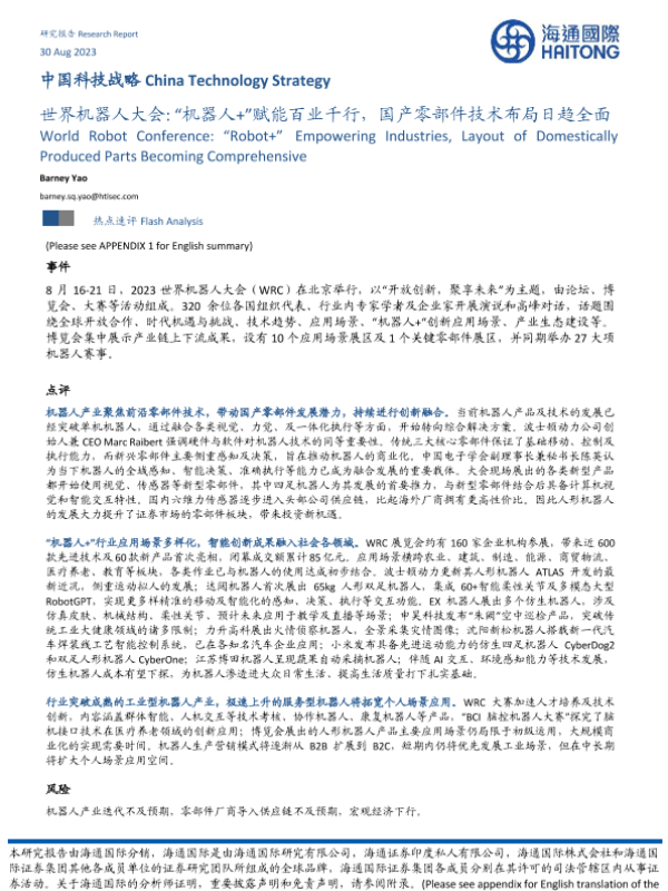 【海通国际】【20230830】世界机器人大会 “机器人+”赋能百业千行,国产零部件技术布局日趋全面-10页 行业研究