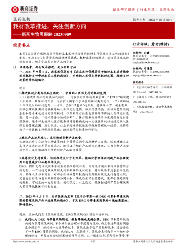 【浙商证券】【20230909】医药生物周跟踪:耗材改革推进,关注创新方向-25页 行业研究
