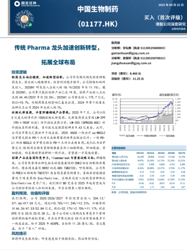 【国金证券】【202509】中国生物制药(01177.HK)传统Pharma龙头加速创新转型,拓展全球布局-46页 证券期货研究报告