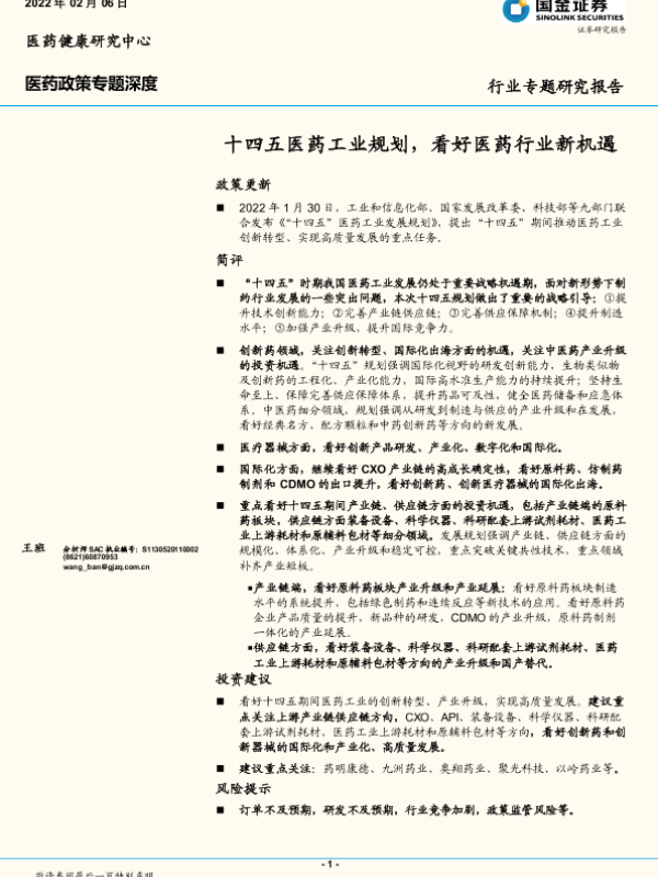 【国金证券】【20220206】医药健康行业专题研究报告:十四五医药工业规划,看好医药行业新机遇-17页 行业研究