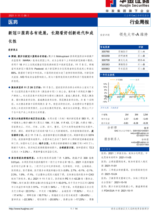 【华金证券】【20211108】医药行业周报:新冠口服药各有进展,长期看好创新迭代和成长性-14页 行业研究