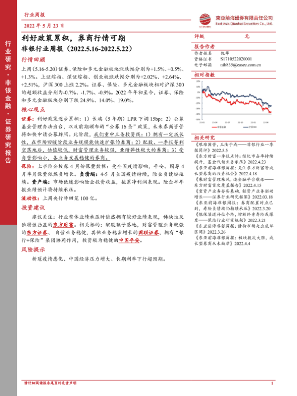 【东亚前海证券】【20220523】非银行业周报:利好政策累积,券商行情可期-9页 行业研究