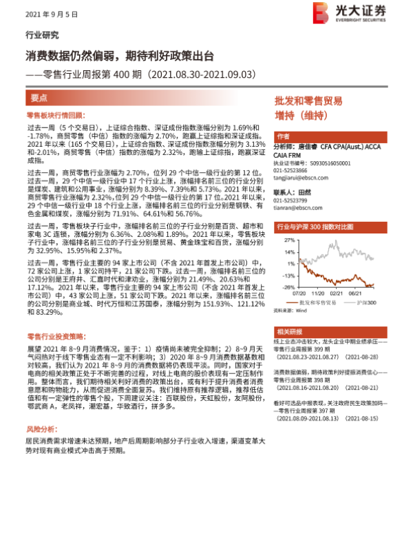 【光大证券】【20210905】零售行业周报第400期:消费数据仍然偏弱,期待利好政策出台-8页 行业研究