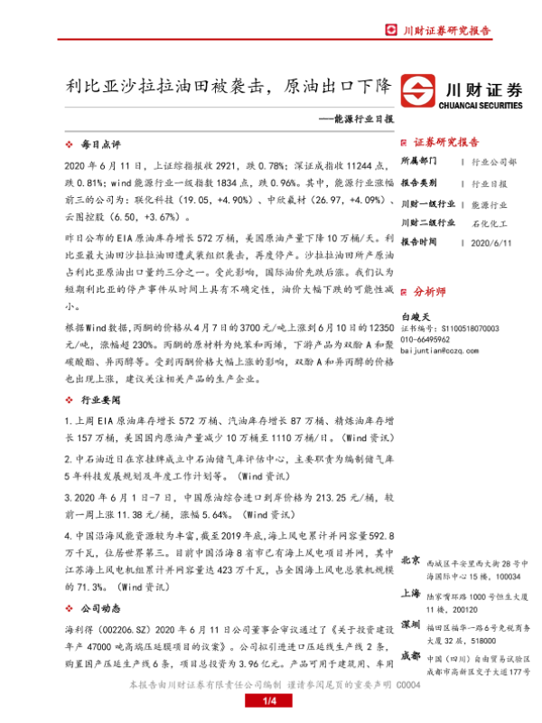 【川财证券】【20200611】能源行业日报:利比亚沙拉拉油田被袭击,原油出口下降-4页 证券期货研究报告