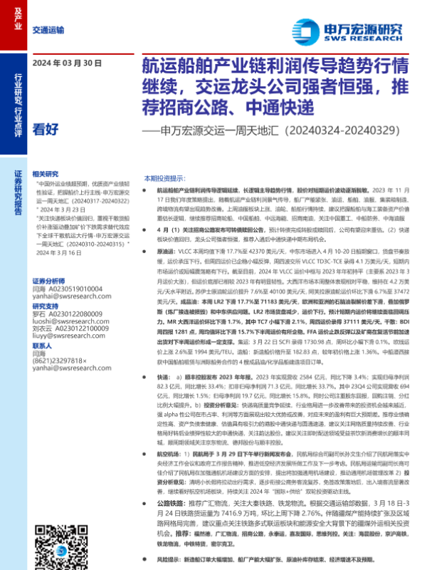 【申万宏源】【20240330】交运行业一周天地汇:航运船舶产业链利润传导趋势行情继续,交运龙头公司强者恒强,推荐招商公路、中通快递-18页 行业研究