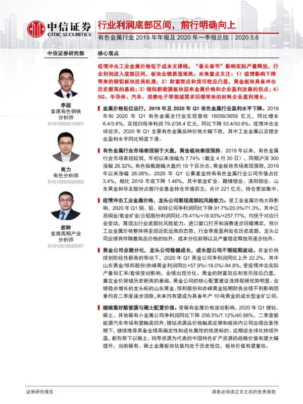 【中信证券】【20200506】有色金属行业2019年年报及2020年一季报总结:行业利润底部区间,前行明确向上-27页 行业研究