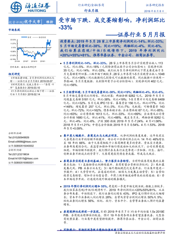 【海通证券】【20190608】证券行业5月月报:受市场下跌、成交萎缩影响,净利润环比-33%-8页 行业研究