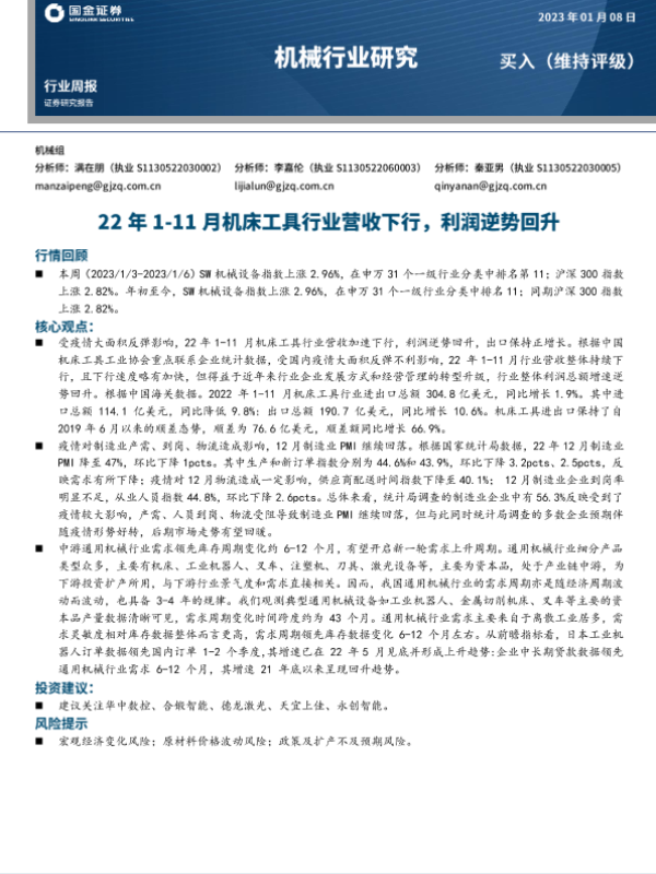 【国金证券】【20230108】20230108-国金证券-机械行业研究:22年1-11月机床工具行业营收下行,利润逆势回升-17页 行业研究