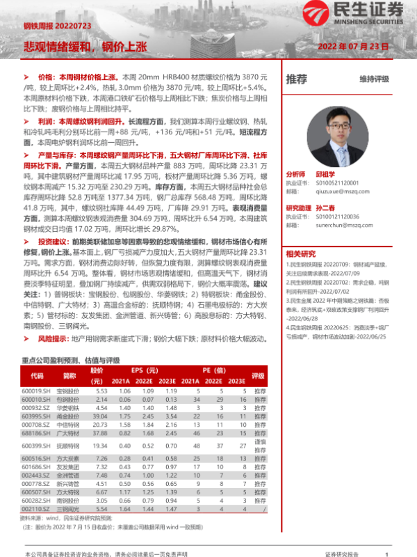 【民生证券】【20220723】钢铁周报:悲观情绪缓和,钢价上涨-20页 行业研究