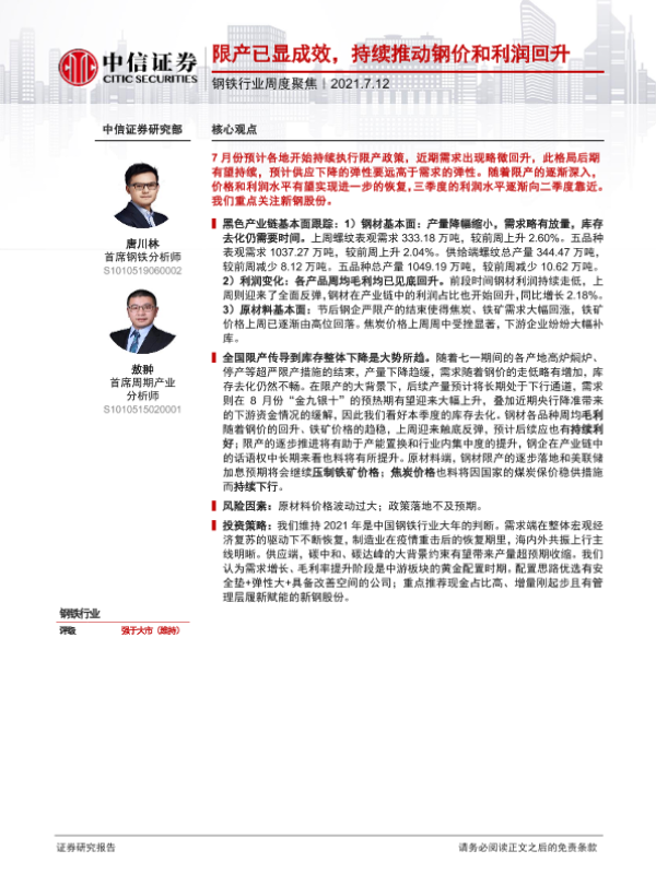 【中信证券】【20210712】20210712-中信证券-钢铁行业周度聚焦:限产已显成效,持续推动钢价和利润回升-8页 行业研究