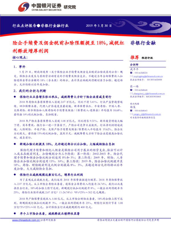 【银河证券】【20190530】险企手续费及佣金税前扣除限额提至18%,减税红利释放增厚利润-5页 行业研究