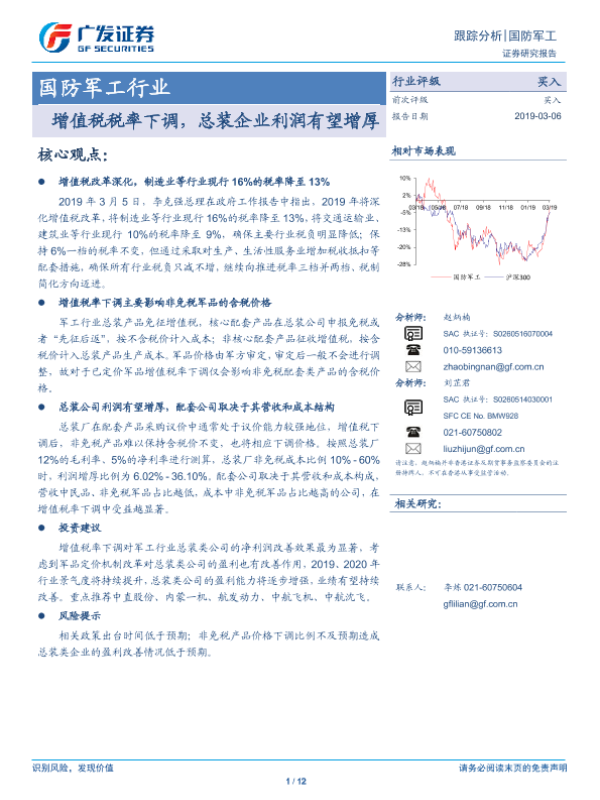 【广发证券】【20190306】国防军工行业:增值税税率下调,总装企业利润有望增厚-12页 行业研究