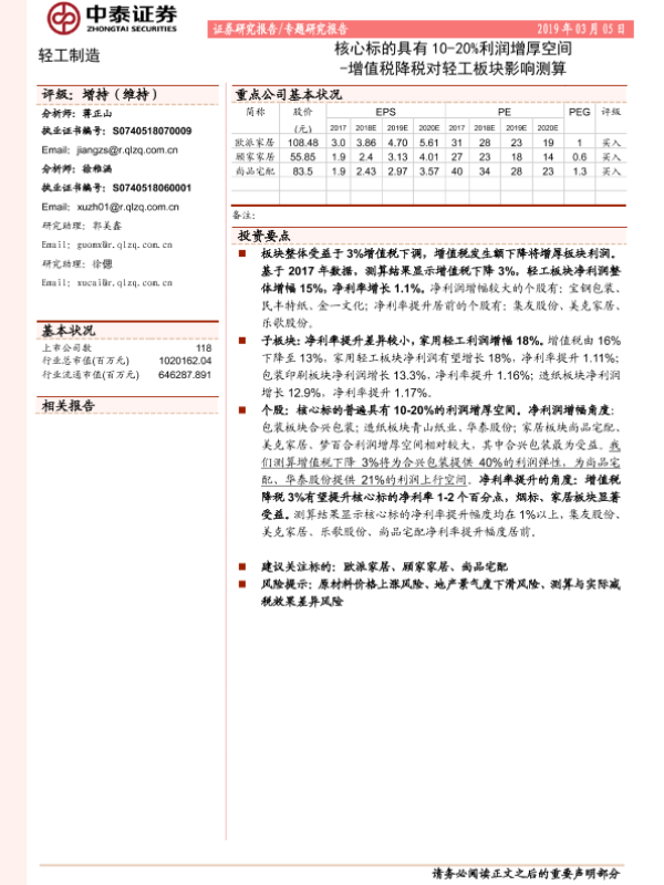 【中泰证券】【20190305】轻工制造行业专题研究报告:核心标的具有10-20%利润增厚空间:增值税降税对轻工板块影响测算-10页 行业研究