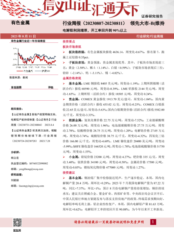 【山西证券】【20230811】有色金属行业周报:电解铝利润增厚,开工率回升到90%以上-19页 行业研究