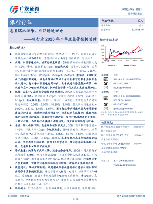 【广发证券】【202508】银行业2025年二季度监管数据总结:息差环比微降,利润增速回升-24页 证券期货研究报告