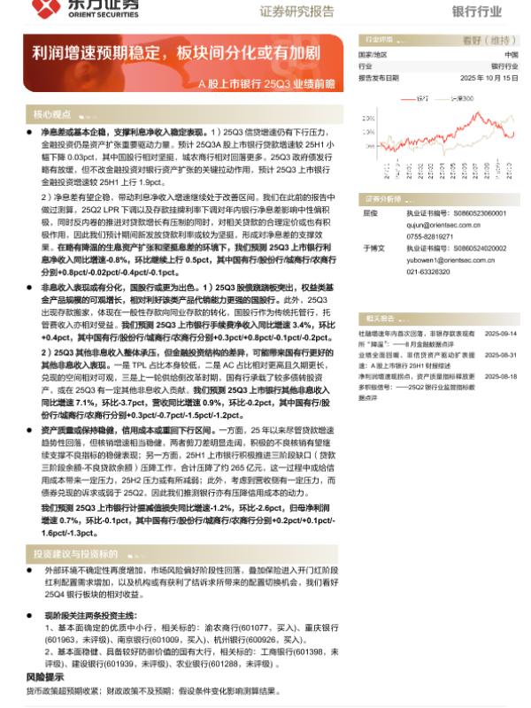 【东方证券】【202510】银行业A股上市银行25Q3业绩前瞻:利润增速预期稳定,板块间分化或有加剧-12页 证券期货研究报告