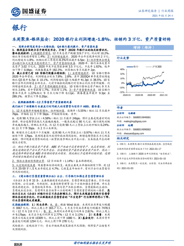 【国盛证券】【20210124】2020银行业利润增速-1.8%,核销约3万亿,资产质量好转-15页 行业研究