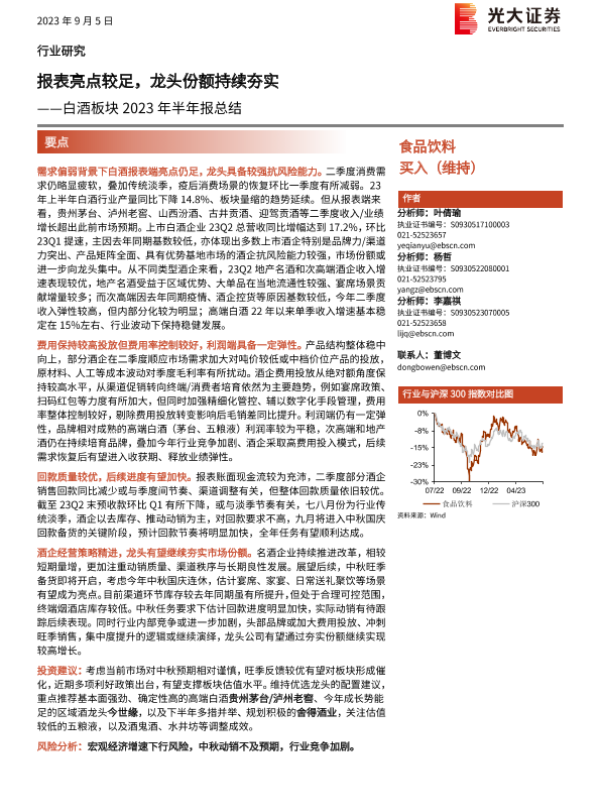 【光大证券】【20230905】白酒板块2023年半年报总结:报表亮点较足,龙头份额持续夯实-14页 行业研究
