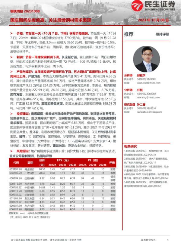 【民生证券】【20231008】钢铁周报:国庆期间垒库偏高,关注后续钢材需求表现-20页 行业研究