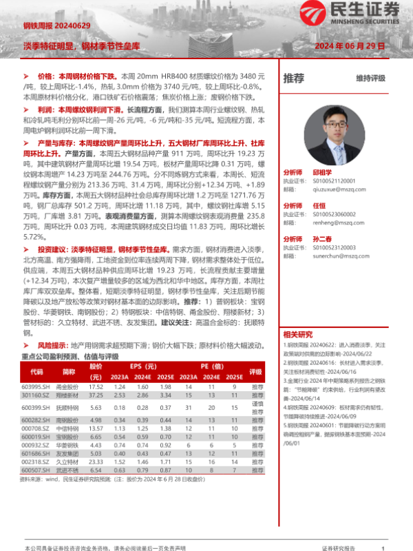 【民生证券】【20240629】20240629-民生证券-钢铁周报:淡季特征明显,钢材季节性垒库-20页 行业研究