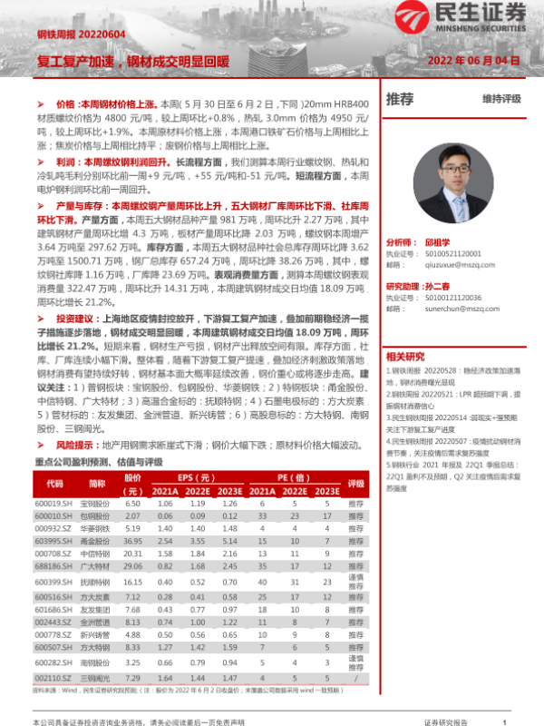 【民生证券】【20220604】20220604-民生证券-钢铁周报:复工复产加速,钢材成交明显回暖-19页 行业研究