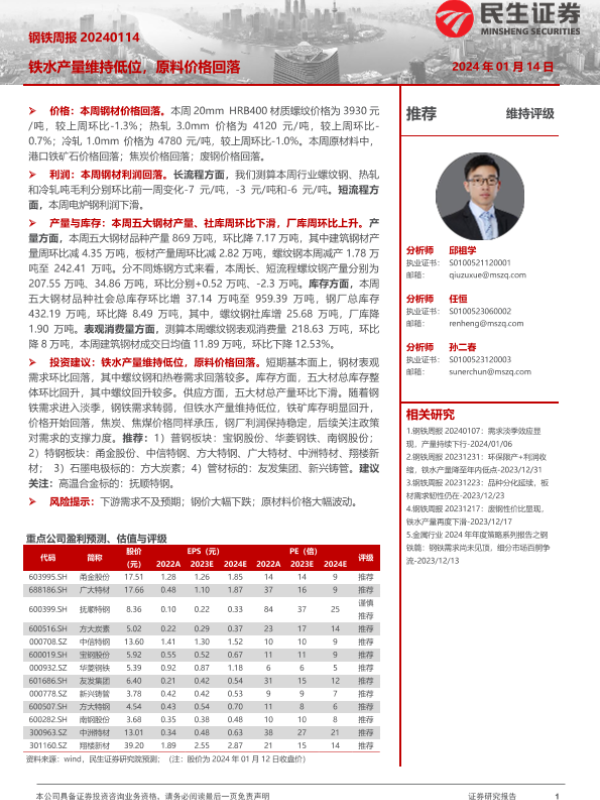 【民生证券】【20240114】20240114-民生证券-钢铁周报:铁水产量维持低位,原料价格回落-20页 行业研究