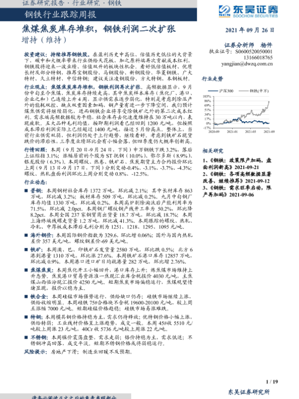【东吴证券】【20210926】20210926-东吴证券-钢铁行业跟踪周报:焦煤焦炭库存堆积,钢铁利润二次扩张-19页 行业研究